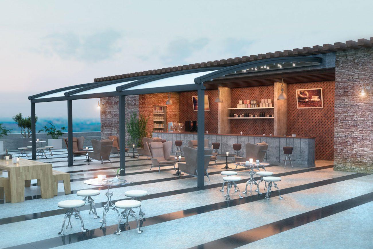 Pergola FLAT ONE je zelo priljubljena pri dvojčkih in stanovanjskih blokih z atrijem. Prav tako je primerna za pokrivanje gostinskih površin, teras ter družabnih prostorov.